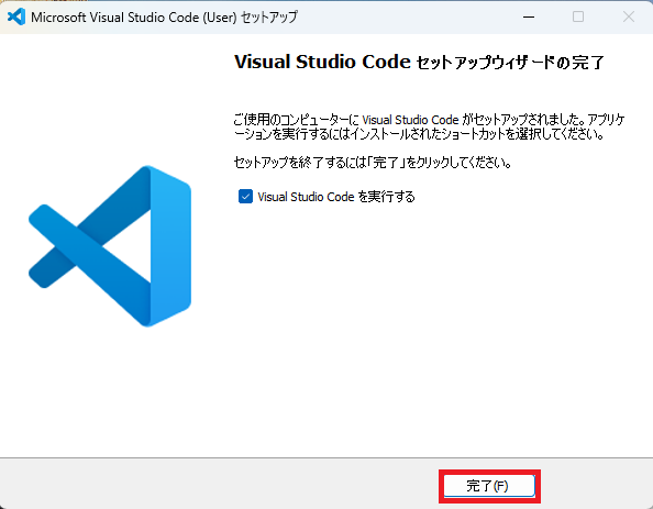 チェックを付けた状態で完了をクリックすると、VSCodeが開きます。これでコーディング環境が整いました!