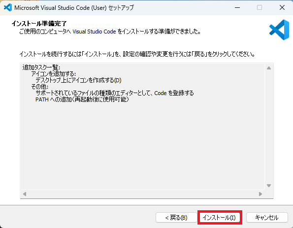下記の画面に切り替わったら「インストール」をクリックします。