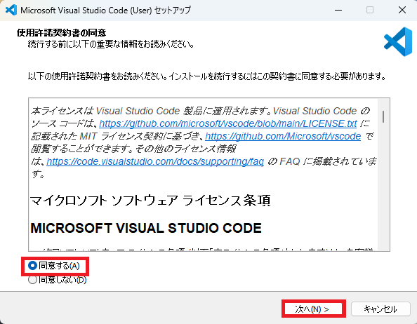 後は、セットアップの手順を下の画像の通りに進めます。最初は同意するをチェックして「次に」をクリックします。