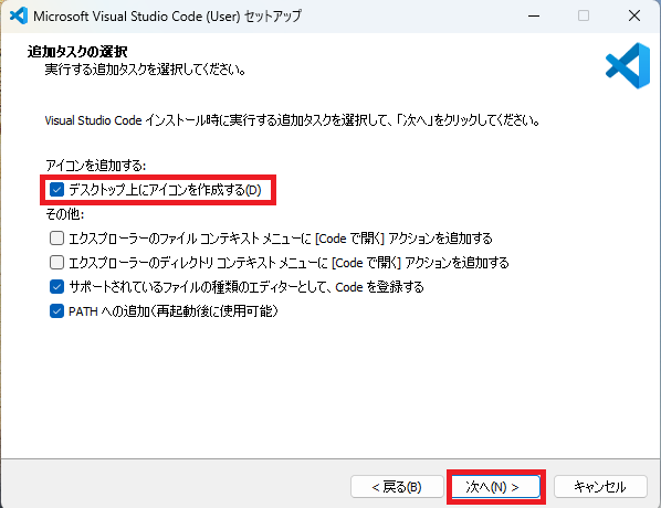 次に進むと、インストール時の設定が出てくるので、PCの扱いに慣れていない方は、「デスクトップ上にアイコンを作成する」にチェックを付けて、「次に」ボタンをクリックします。