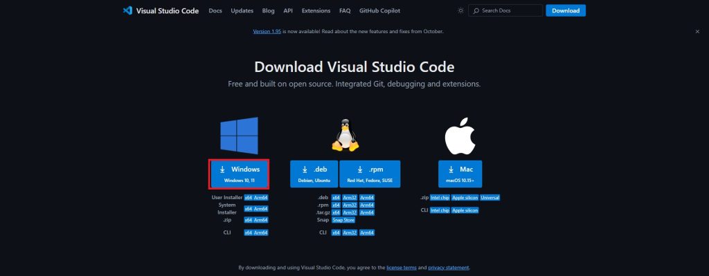 コードエディタにもいろいろあり、最近流行のエディタですと、AIの技術を使用できる「coursor」、高機能でプラグインも充実している「VSCode」、「Sublime」やLinuxでデフォルトで使用できる「Vim」など様々なプログラミングを補助するエディタがあります。その中でも今回は筆者も愛用している「VSCode」をインストールしていきます。