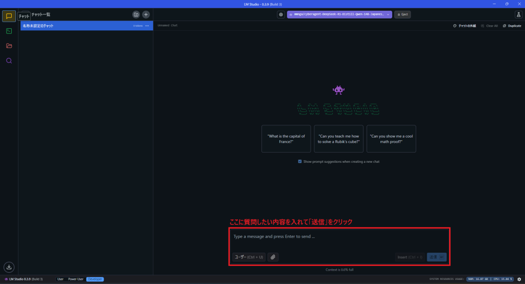 そうするとAIに聞きたいことを質問できるようになるので、何かを入力して、「送信」を押してみましょう!