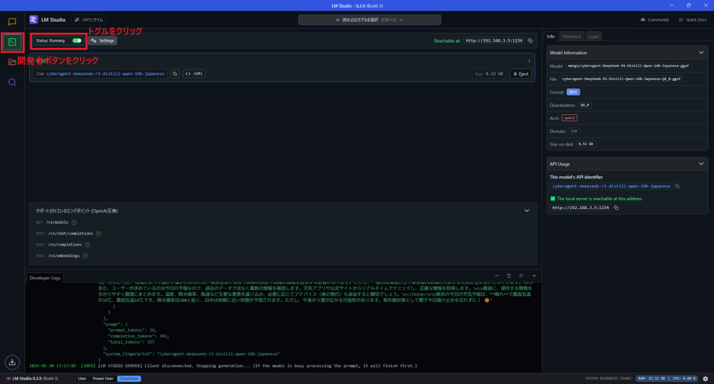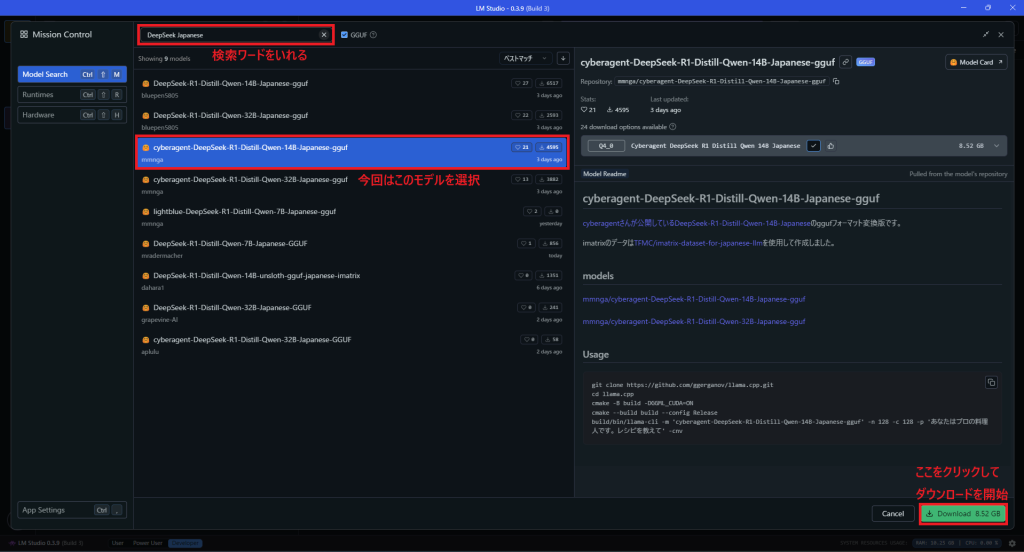 そうしたら下の画像の画面が開くので、目当てのモデル名を検索バーに入れます。今回は「DeepSeek-R1-Distill-Qwn-14B-Japanese-gguf」と入れてダウンロードを開始します。モデルのダウンロードが完了したら右下の「Load Model」をクリックしてください。