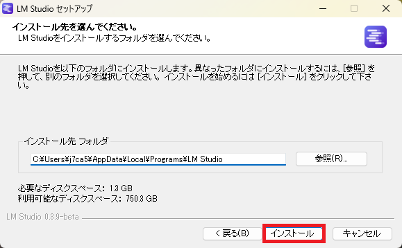 フォルダの「LM-Studio-x.x.x-x-x64.exe」ファイルをダブルクリックするとインストール画面に進みます。