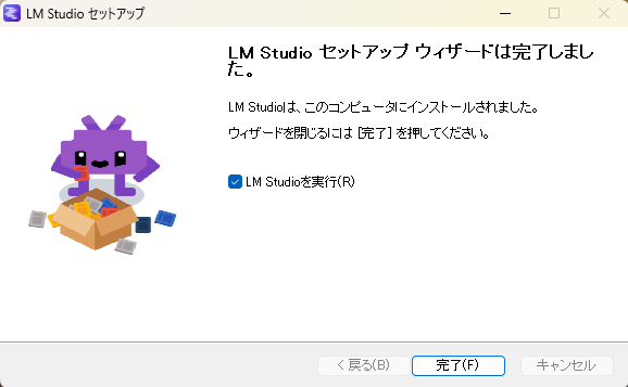 上記の画面が出たら、「完了」ボタンをクリックして「LM Studio」のインストールは完了になります。次にLLMのモデルをインストールして、サーバーを立ち上げていきます。