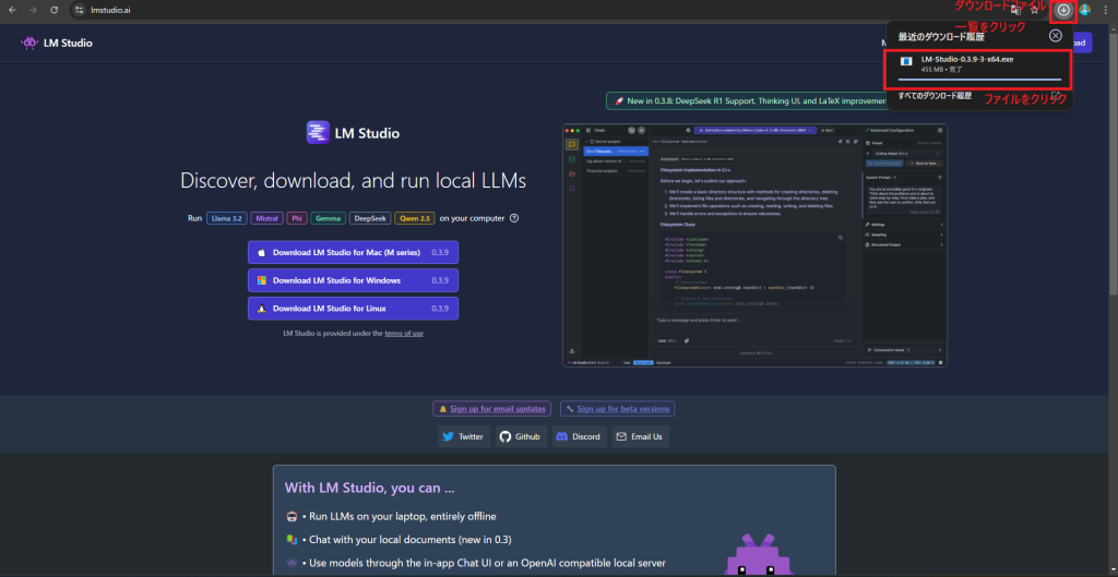 お使いのOSの種類のダウンローダーを選択します。筆者の環境では「Windows11」を使用しているので、「Download LLM Studio for Windows」を選択してダウンロードを開始します。次にフォルダを開いてインストーラーを実行します。ファイルの場所がわからない方は「Google Chrome」をお使いであれば右上の「ダウンロード」ボタンから、目的のファイルをクリックすると、そのファイルがある場所のフォルダを自動で開くことができます。