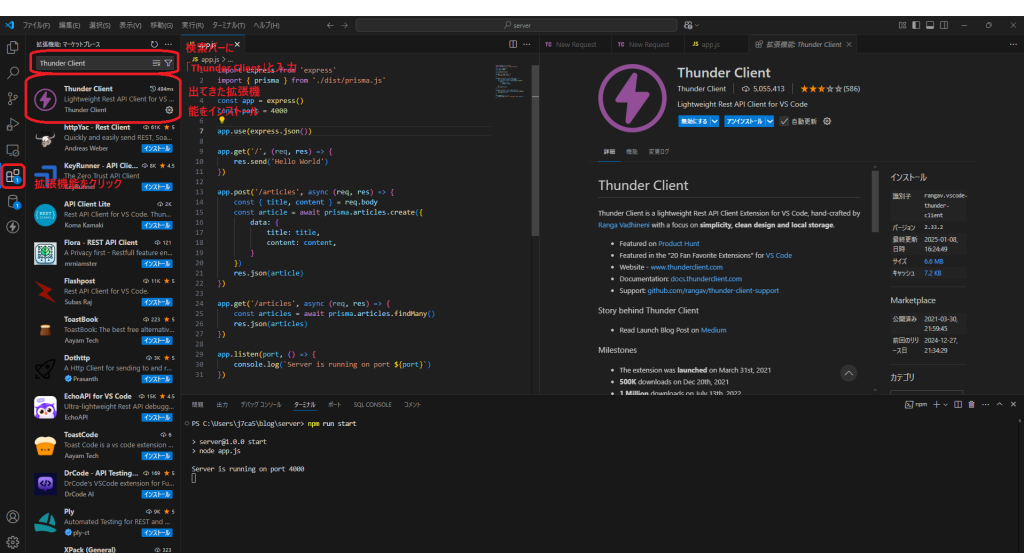 リクエストを送信するにはテストコードを記述してもよいのですが、ここでは「Postman」やVSCodeの拡張機能である「Thunder Client」などのWebAPI開発時に便利なツールを紹介します。今回は新しくアプリケーションを入れる手間を省略するためにVSCodeを使っている人であればだれでも無料で使用することができる拡張機能「Thunder Client」を使ってテストを進めていきます。サイドバーにある「拡張機能」から検索バーを使って「Thunder Client」と入力して出てきたものをインストールします。
