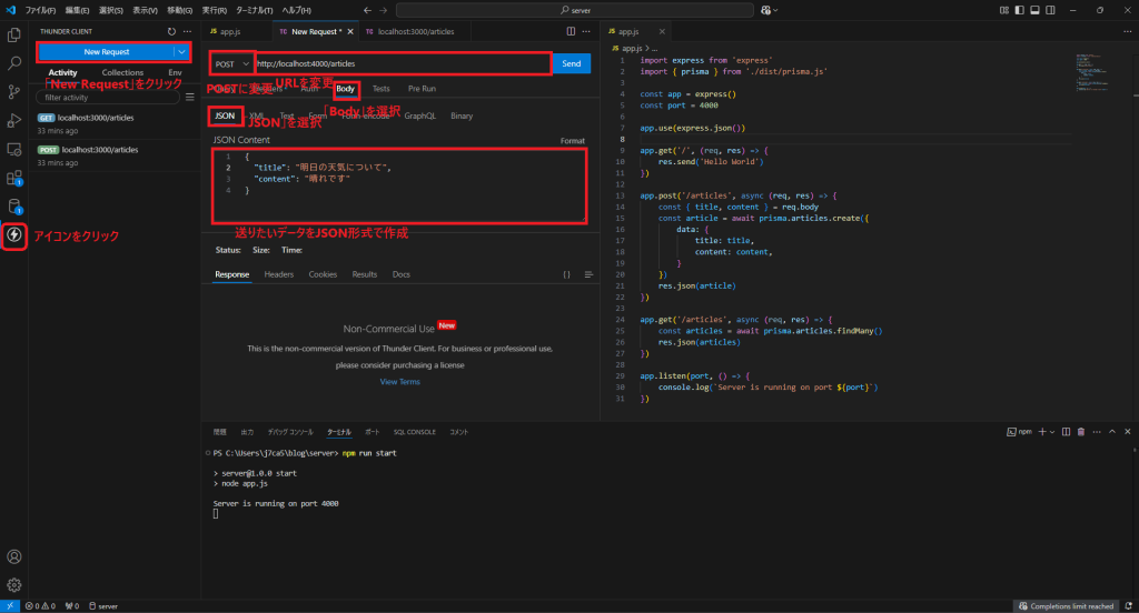 インストールが終わったら、再度バーに出てくる稲妻のアイコンをクリックして「New Request」をクリックします。そしたら下の画像のように「POST」リクエストに変更、URLを「http://localhost:4000/articles」に変更、Bodyを選択、JSONを選択し、JSON Contentの中に送りたいJSONデータを入力します。