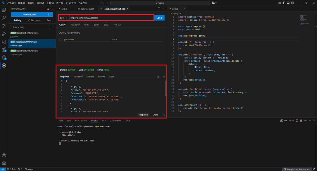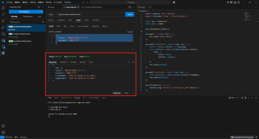 「Server is running on port 4000」という文字がターミナルに出力されたら終了です。